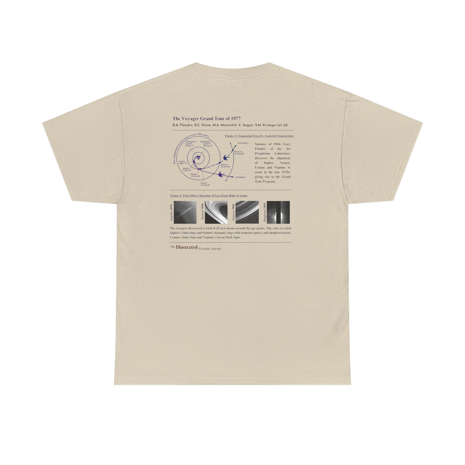 This Voyager Science Tee features a fully illustrated front graphic styled like a scientific journal cover, celebrating NASA's 1977 Grand Tour mission that launched the Voyager probes during a rare planetary alignment. The front highlights spacecraft components: magnetometer, plasma wave antenna and more, while crediting key scientists behind the mission, including Flandro, Stone, Minovitch, Sagan, and Krimigis.